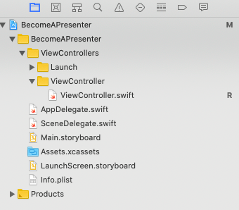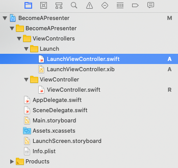 Lets us clean up some file structure by creating a Group called ViewControllers and also create two sub-groups, ViewController and Launch. Then move the default ViewController inside ViewController and forget about it as we will create LaunchViewController. You should have following group structure.