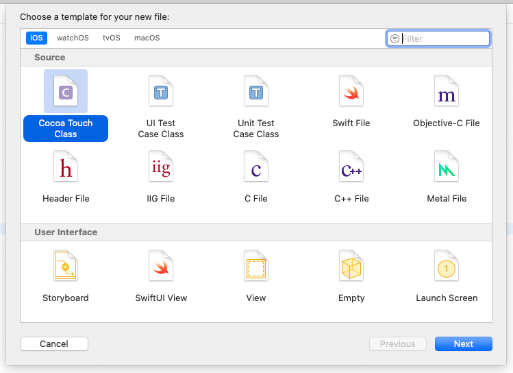 We will create LaunchViewController – subclass of UIViewController and also its Nib file. Select the Launch sub-group inside ViewControllers group and click on File – New File and select Cocoa Touch Class.