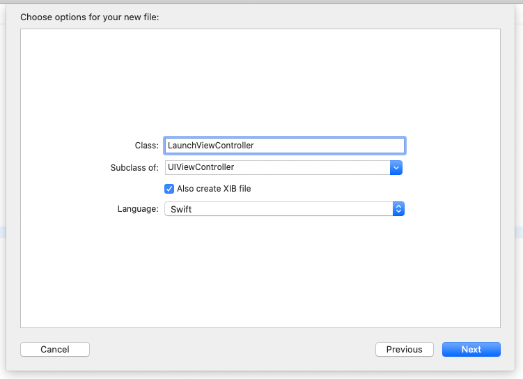 Click Next and enter UIViewController as subclass and provide LaunchViewController as name in Class. Make sure to select “Also create XIB file”