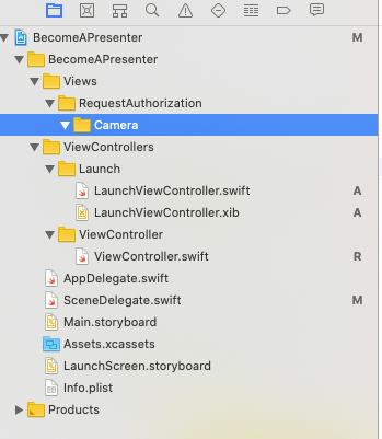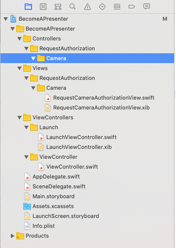 Create a separate group called Controllers and a within the Controllers group, create group called RequestAuthorization. Further, create Camera group inside RequestAuthorization group. You shall end up having: