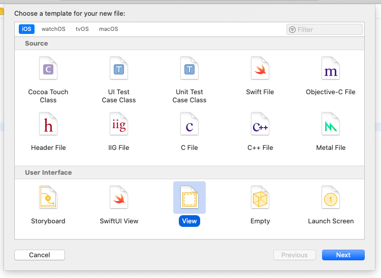 Click Next and Create in next screen. We will create Nib file next for the View. Select the Camera group one more time and Select File – New and select View.