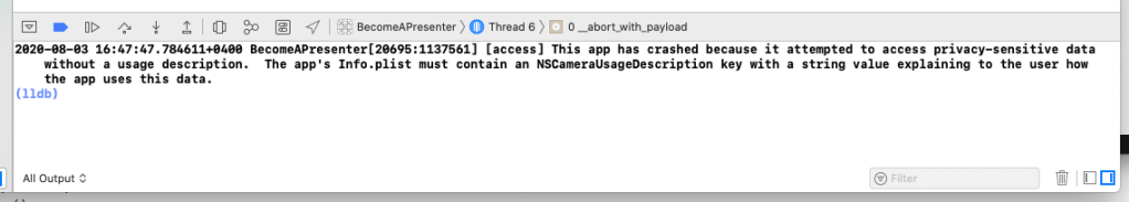 Build and run app once more and this time hit the Allow button and boom, you get a crash.