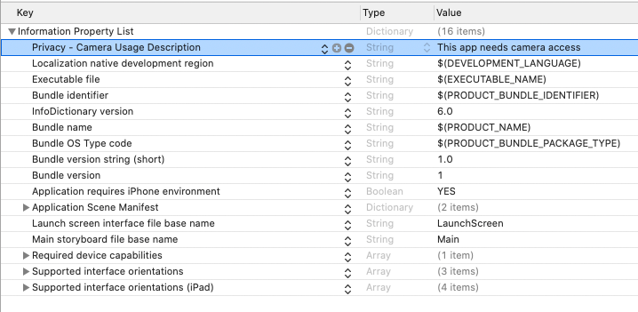 Head to Info.plist file and create a new entry with Privacy-Camera Usage Description and enter your message. Once you are done, your file should look like below:
